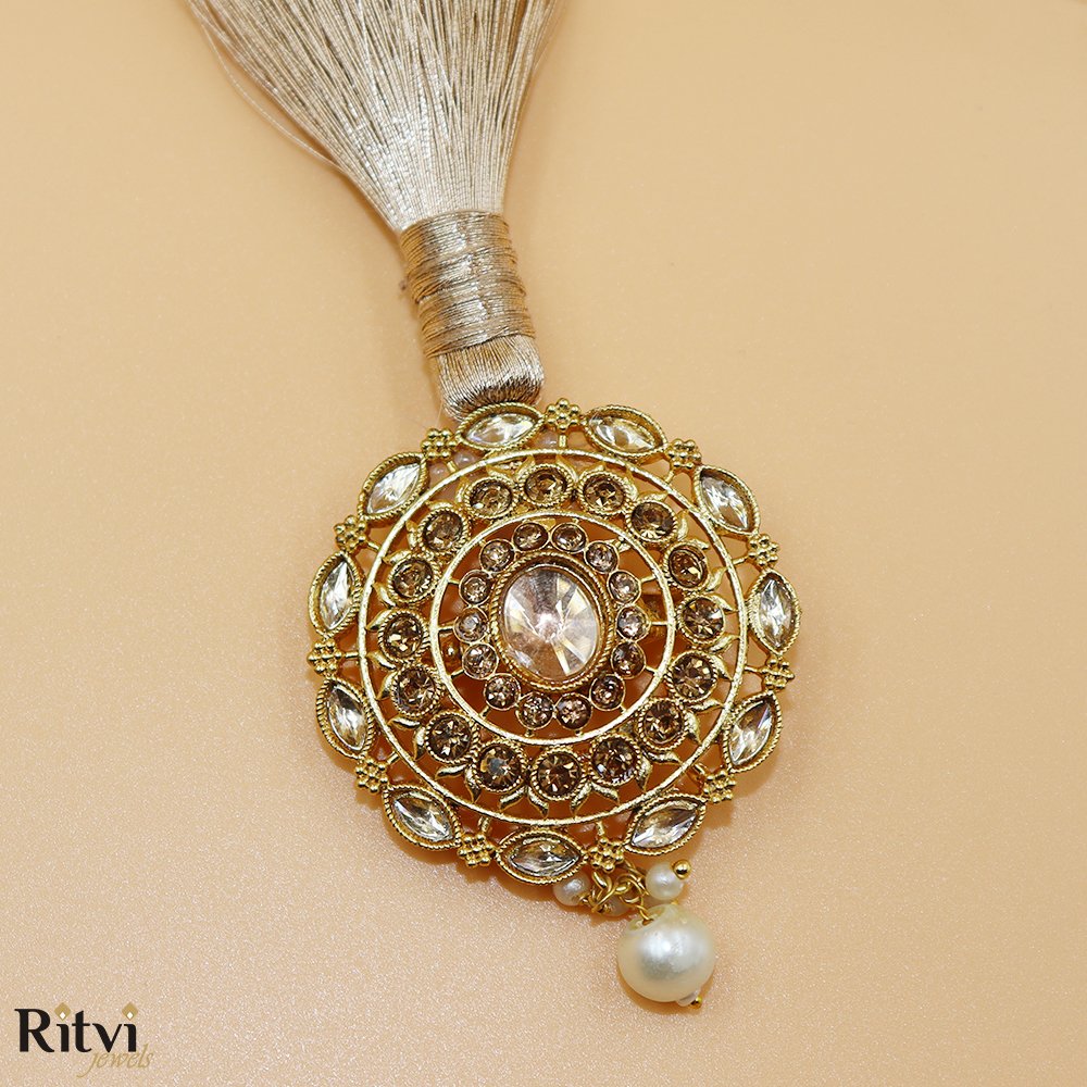 Intricate Kundan/Stone Work: A large central clear stone surrounded by concentric circles of smaller champagne and white crystals.